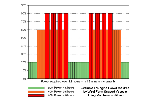 Many vessels have hours of waiting in the wind farms, as they are on standby they cannot anchor. Loitering at low speed and low revs is not an efficient load cycle for diesel engines, plus it leads to increased maintenance and reduced engine life. This loitering period could be on battery power. Later in the day diesel power is used for the high speed transit back to port, the batteries are re-charging. At the outer sea buoys battery electric power takes over to enter the harbour, with zero emissions. Around 18.00 the vessel returns to the dock where shore power is re-connected for overnight charging.