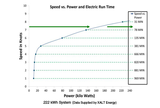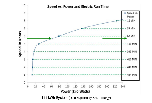 current and zero wind conditions. Separate allowances can be made for favourable or opposing current and or wind. The main objective is identifying how many Kilowatts of battery energy are required to replace Kilowatts of diesel energy.